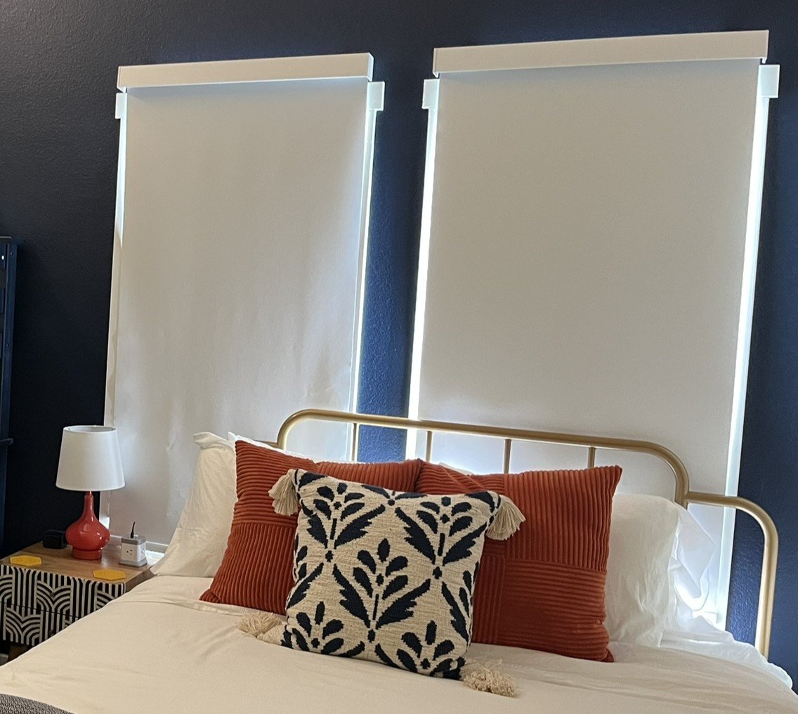 We truly love these! They are so budget friendly and they come in so many different colors to match any décor. For maximum blackout, make sure that you choose proper sizing and don’t leave gaps. Mounting outside of the frame maximizes blackout. We mount inside the frame for living areas and outside for bedrooms.