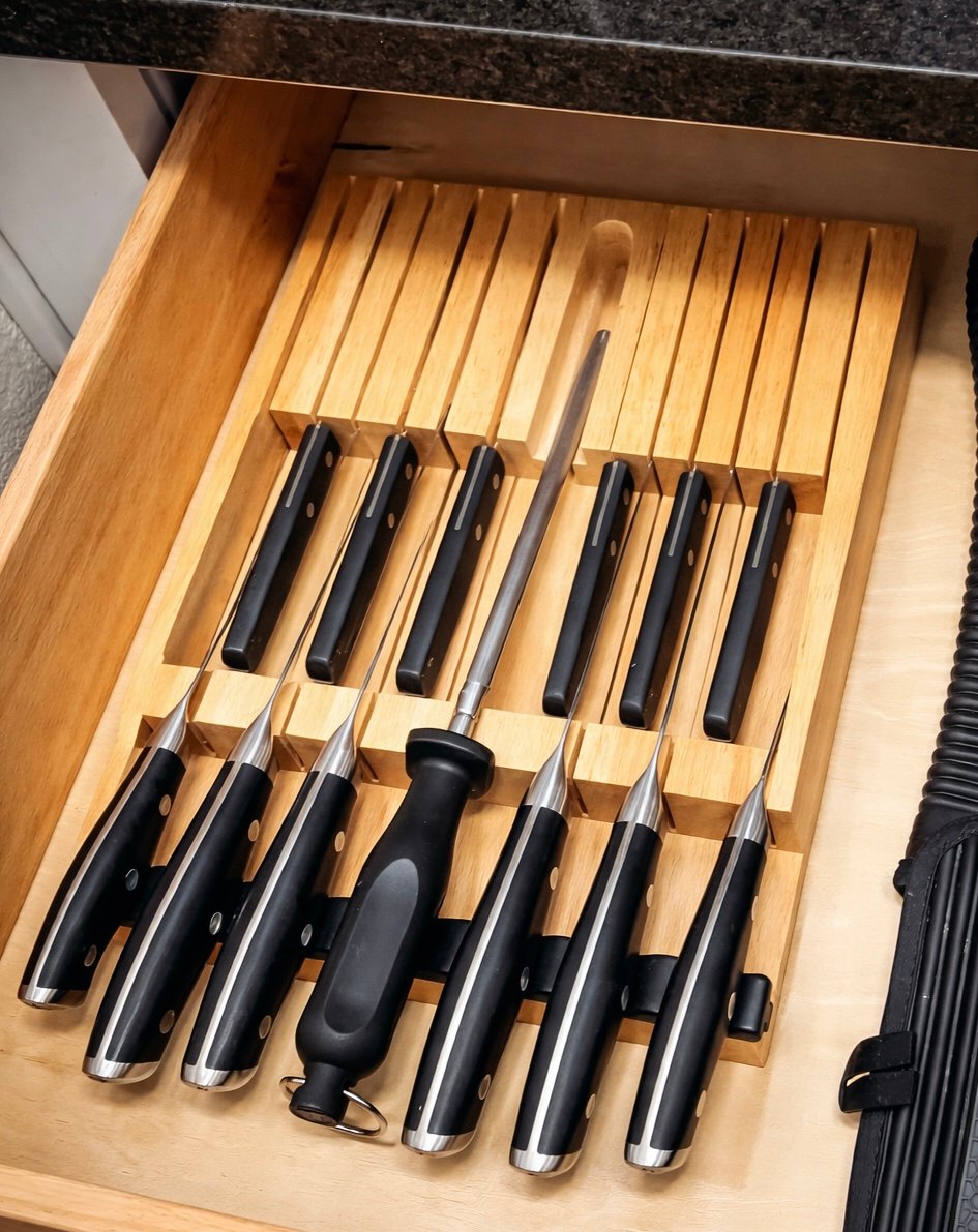 Keep your kitchen streamlined with this drawer-friendly knife set designed for compact storage. The low-profile block fits perfectly inside most drawers, protecting blades while keeping them easily accessible. Built for everyday cooking, the durable knives handle everything from chopping vegetables to slicing meats. A practical and space-saving solution for organized kitchens.