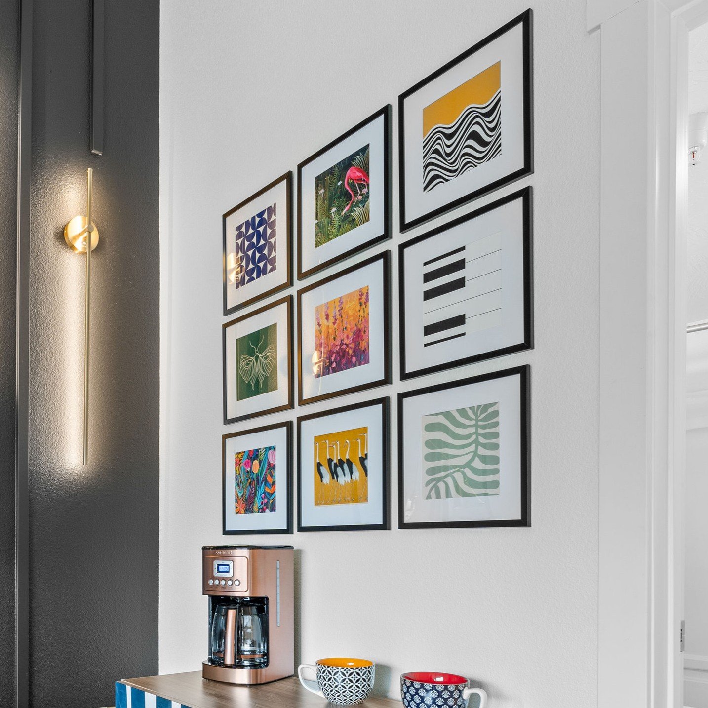 Create a stylish gallery wall with this versatile 12×12 picture frame set designed for flexible display. Each frame can hold 8×8 photos with the included mat or full 12×12 prints without it. We use this set with fun prints above our bedroom coffee bar, making it a great option for adding personality to a space. It’s an easy and budget-friendly way to elevate wall decor.
