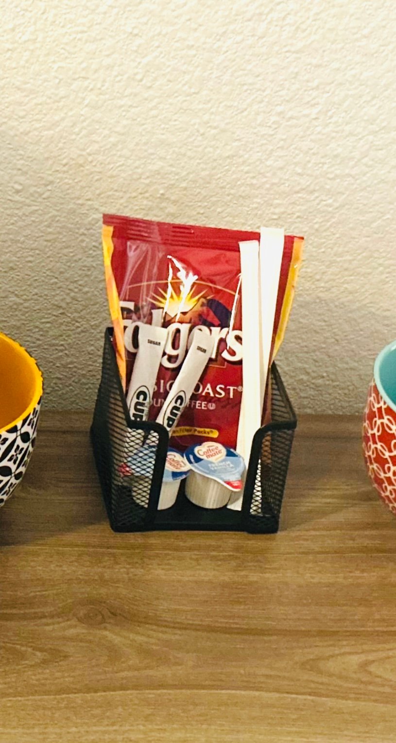 This black metal mesh organizer is a simple but functional addition to a bedroom coffee bar. It is perfect for holding coffee pods, tea, sweeteners, or small accessories in one easy to reach place. The durable metal design holds up well to daily use and keeps the space looking organized instead of cluttered. We love using it to make the coffee setup feel thoughtful, tidy, and guest ready.
