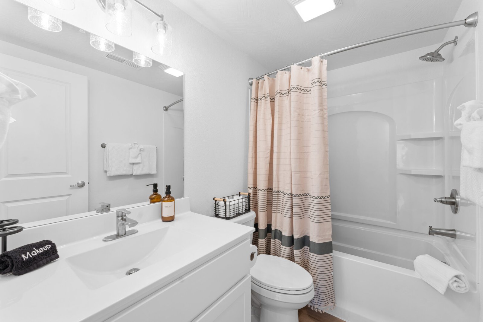 This olive green striped shower curtain is an easy way to add color and texture without overwhelming the bathroom. The neutral tones pair well with a variety of decor styles. It works well in homes and vacation rentals where a calm, cohesive look matters. A great shower curtain option for hosts looking for style that is still practical and guest friendly.